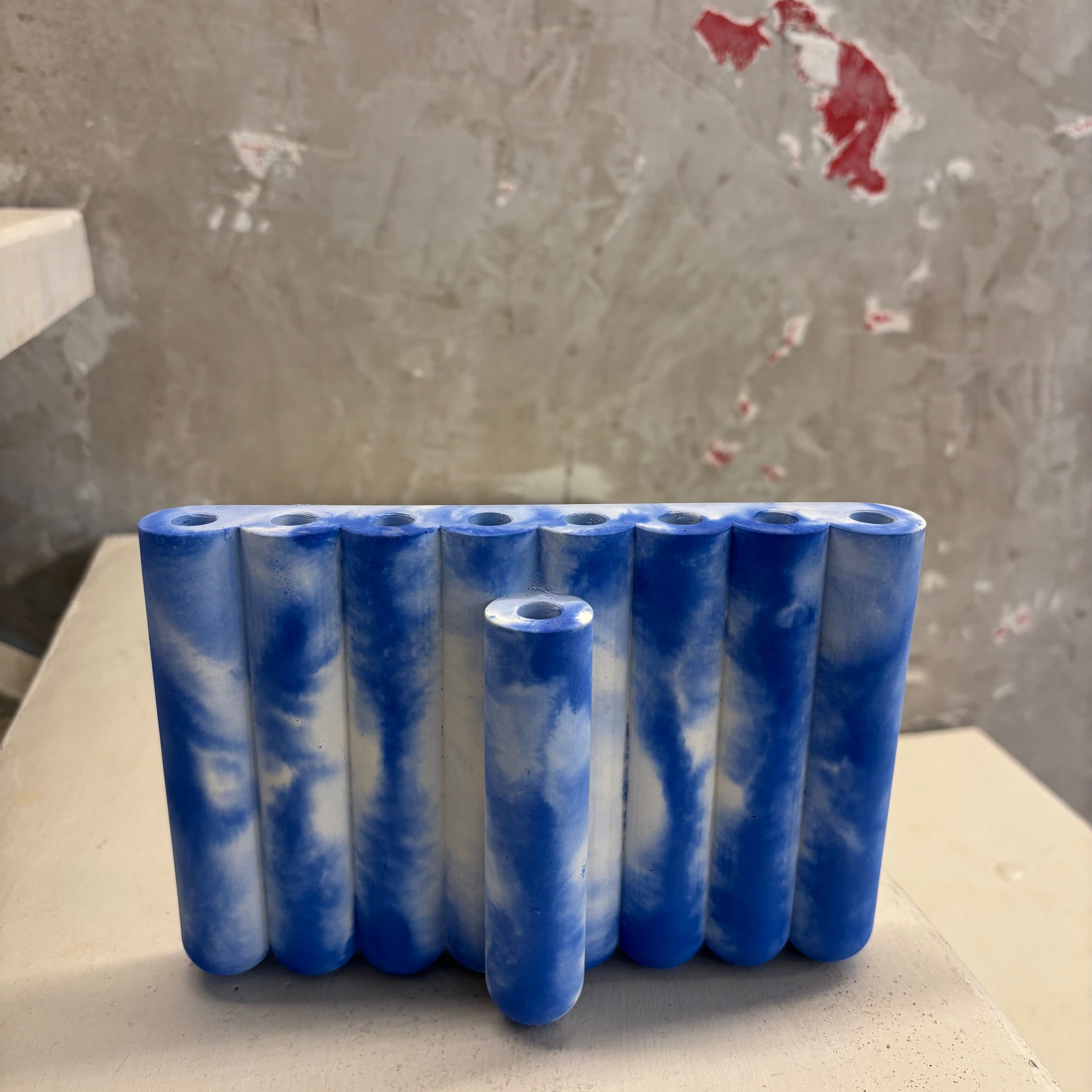 This hand-poured concrete kosher Hanukkah Menorah represents the traditional candlestick in a contemporary way. The natural concrete material is impregnated resulting in an easy wax removal.
